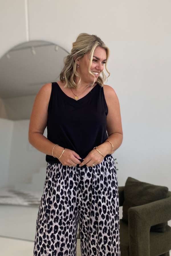 The Luna Bamboo Sleeveless Top in Black is your go-to versatile essential for effortless everyday styling. Crafted from luxuriously soft bamboo fabric, it features a flattering V-neckline, a sleeveless design for breathability, and a gently curved hemline that can be worn loose or tucked in.